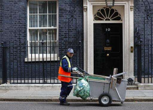 A street cleaner in Downing Street, London, Friday March 29, 2019. On the day that Britain was originally scheduled to leave the European Union, lawmakers will vote Friday on what Prime Minister Theresa May's government described as the "last chance to vote for Brexit." (AP Photo/Alastair Grant) The Associated Press