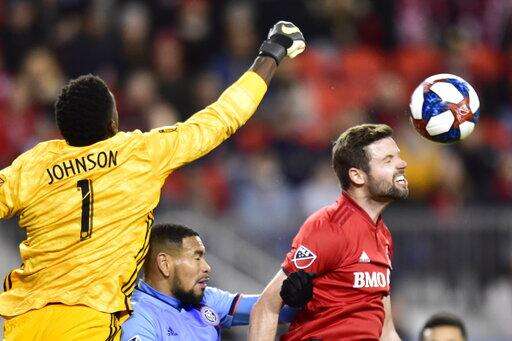 Toronto FC defender Drew Moor, right, New York City FC defender Alexander Callens, center, and New York City FC goalkeeper Sean Johnson (1) battle during first-half MLS soccer action in Toronto, Friday, March 29, 2019. (Frank Gunn/The Canadian Press via AP)