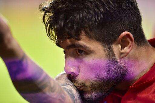 Toronto FC's Alejandro Pozuelo kisses his tattoo as he celebrates after scoring on a penalty shot against New York City FC during second-half MLS soccer action in Toronto, Friday, March 29, 2019. (Frank Gunn/The Canadian Press via AP)