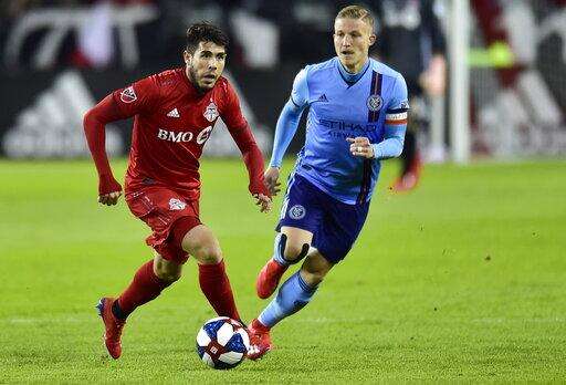 Toronto FC's Alejandro Pozuelo, left, moves the ball as New York City FC midfielder Alexander Ring (8) defends during first-half MLS soccer action in Toronto, Friday, March 29, 2019. (Frank Gunn/The Canadian Press via AP)