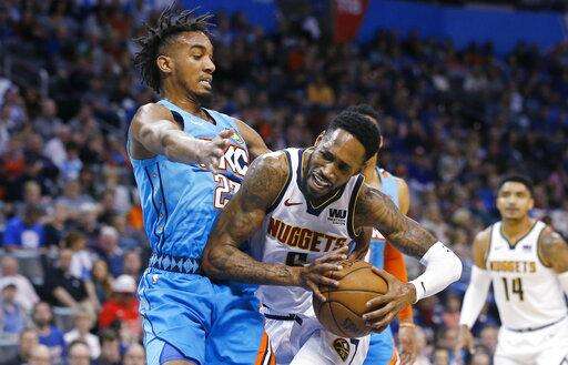 Denver Nuggets guard Will Barton, right, drives against Oklahoma City Thunder guard Terrance Ferguson, left, in the first half of an NBA basketball game Friday, March 29, 2019, in Oklahoma City. (AP Photo/Sue Ogrocki) The Associated Press