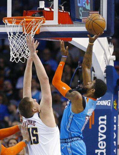 Oklahoma City Thunder forward Paul George, right, shoots in front of Denver Nuggets center Nikola Jokic (15) in the first half of an NBA basketball game Friday, March 29, 2019, in Oklahoma City. (AP Photo/Sue Ogrocki) The Associated Press