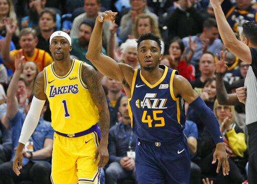 Utah Jazz guard Donovan Mitchell (45) celebrates after scoring 3-pointer against Los Angeles Lakers guard Kentavious Caldwell-Pope (1) during the first half of an NBA basketball game Wednesday, March 27, 2019, in Salt Lake City. (AP Photo/Rick Bowmer)