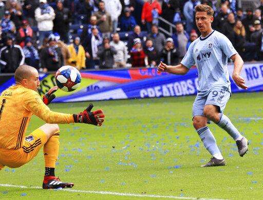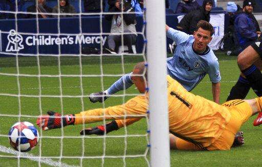 Montreal Impact goalkeeper Evan Bush reaches for the ball as Sporting Kansas City forward Krisztian Nemeth watches his shot go in the goal in the 43th minute Saturday, March 30, 2019, during an MLS match in Kansas City, Mo. (Ryan Weaver/The Kansas City Star via AP) The Associated Press