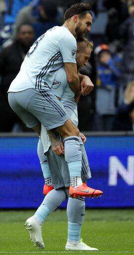 Sporting Kansas City's Graham Zusi turns to celebrate with Felipe Gutierrez after Gutierrez put Sporting KC up 3-0 just before halftime Saturday, March 30, 2019, during an MLS match in Kansas City, Mo. (Ryan Weaver/The Kansas City Star via AP) The Associated Press