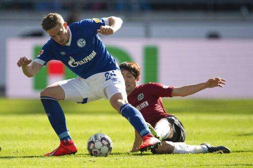 Schalke's Bastian Oczipka, left, and Hannovers Genki Haraguchi challenge for the ball during the German Bundesliga soccer match between Hannover 96 and FC Schalke 04 in Hannover, Germany, Sunday, Marc 31, 2019. (Sven Pfoertner/dpa via AP) The Associated Press
