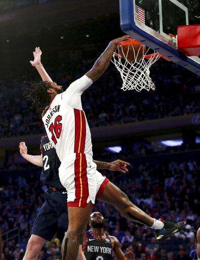 Miami Heat forward James Johnson (16) dunks against New York Knicks forward Luke Kornet (2) during the first half of an NBA basketball game Saturday, March 30, 2019, in New York. (AP Photo/Nicole Sweet) The Associated Press