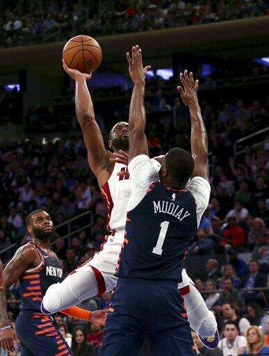 Miami Heat's Dwyane Wade shoots over New York Knicks' Emmanuel Mudiay during the first half of an NBA basketball game Saturday, March 30, 2019, in New York. (AP Photo/Nicole Sweet) The Associated Press