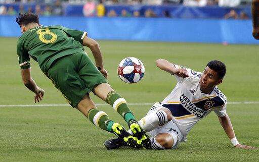 Los Angeles Galaxy midfielder Joe Corona, right, defends on Portland Timbers midfielder Diego Valeri, left, during the first half of an MLS soccer match Sunday, March 31, 2019, in Carson, Calif. (AP Photo/Marcio Jose Sanchez)
