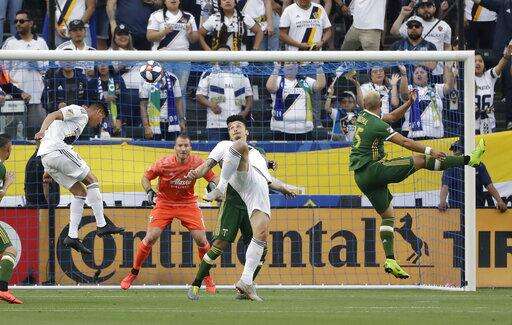 Los Angeles Galaxy's Joe Corona, left, heads the ball next to teammate Zlatan Ibrahimovic and Portland Timbers defender Bill Tuiloma, right, during the first half of an MLS soccer match Sunday, March 31, 2019, in Carson, Calif. (AP Photo/Marcio Jose Sanchez)