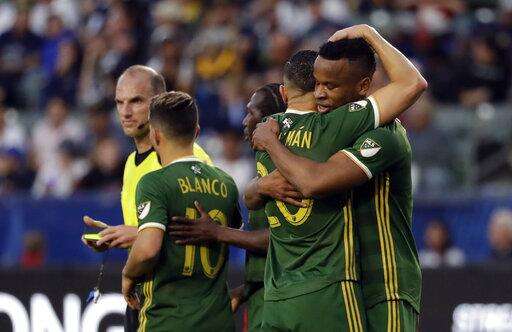 Portland Timbers forward Jeremy Ebobisse, right, hugs teammate David Guzman after Ebobisse's goal against the Los Angeles Galaxy during the first half of an MLS soccer match Sunday, March 31, 2019, in Carson, Calif. (AP Photo/Marcio Jose Sanchez)