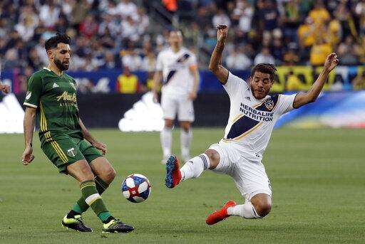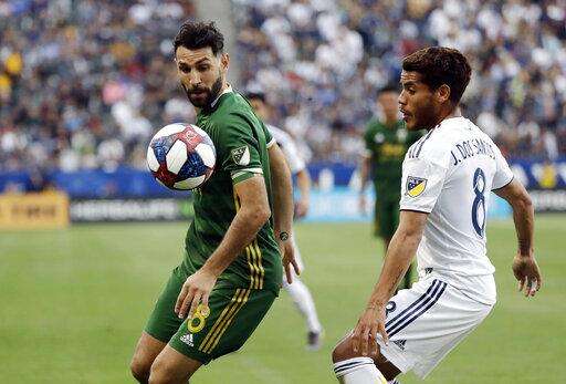 Portland Timbers midfielder Diego Valeri, left, controls the ball next to Los Angeles Galaxy midfielder Jonathan dos Santos, right, during the first half of an MLS soccer match Sunday, March 31, 2019, in Carson, Calif. (AP Photo/Marcio Jose Sanchez)