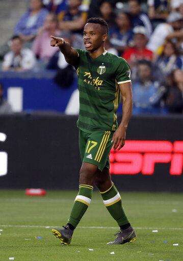 Portland Timbers forward Jeremy Ebobisse (17) celebrates after scoring against the Los Angeles Galaxy during the first half of an MLS soccer match Sunday, March 31, 2019, in Carson, Calif. (AP Photo/Marcio Jose Sanchez)
