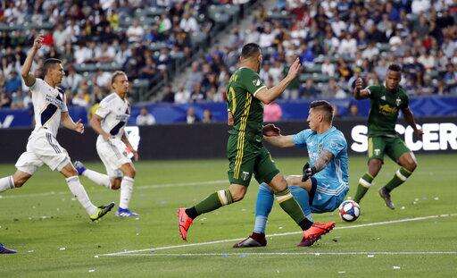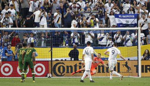 Los Angeles Galaxy forward Zlatan Ibrahimovic (9) scores on a penalty kick past Portland Timbers goalkeeper Jeff Attinella, in orange, during the first half of an MLS soccer match Sunday, March 31, 2019, in Carson, Calif. (AP Photo/Marcio Jose Sanchez)