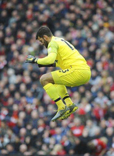 Liverpool goalkeeper Alisson Becker jumps during the English Premier League soccer match between Liverpool and Tottenham Hotspur at Anfield stadium in Liverpool, England, Sunday, March 31, 2019. (AP Photo/Rui Vieira) The Associated Press