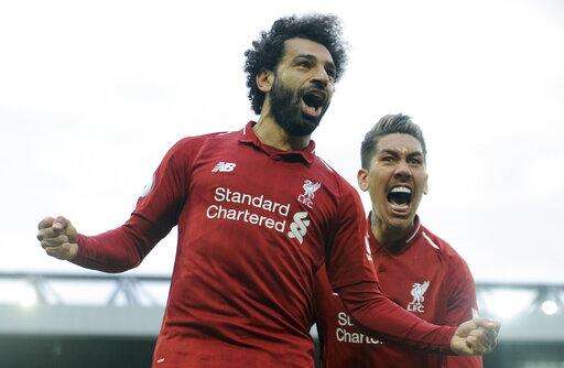 Liverpool's Mohamed Salah, left, and Liverpool's Roberto Firmino celebrate after Tottenham's Toby Alderweireld scores an own goal past his goalkeeper during the English Premier League soccer match between Liverpool and Tottenham Hotspur at Anfield stadium in Liverpool, England, Sunday, March 31, 2019. (AP Photo/Rui Vieira) The Associated Press