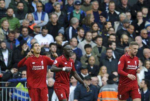 Liverpool's Roberto Firmino, left, celebrates with teammates after scoring his side's opening goal during the English Premier League soccer match between Liverpool and Tottenham Hotspur at Anfield stadium in Liverpool, England, Sunday, March 31, 2019. (AP Photo/Rui Vieira) The Associated Press