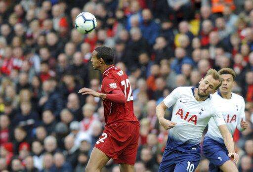 Liverpool's Joel Matip, left, jumps for the ball with Tottenham's Harry Kane, front right, during the English Premier League soccer match between Liverpool and Tottenham Hotspur at Anfield stadium in Liverpool, England, Sunday, March 31, 2019. (AP Photo/Rui Vieira) The Associated Press