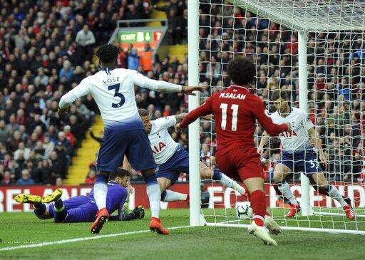 Tottenham's Toby Alderweireld, center, scores an own goal past his goalkeeper during the English Premier League soccer match between Liverpool and Tottenham Hotspur at Anfield stadium in Liverpool, England, Sunday, March 31, 2019. (AP Photo/Rui Vieira) The Associated Press