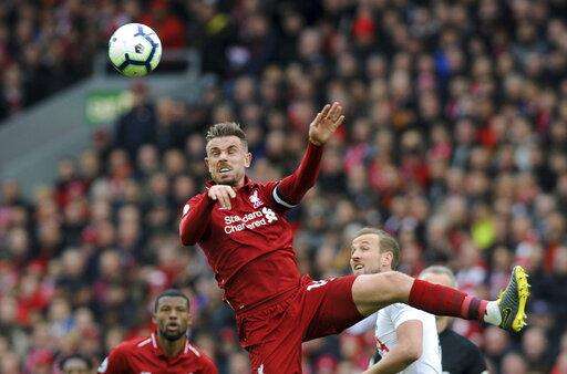 Liverpool's Jordan Henderson heads the ball during the English Premier League soccer match between Liverpool and Tottenham Hotspur at Anfield stadium in Liverpool, England, Sunday, March 31, 2019. (AP Photo/Rui Vieira) The Associated Press
