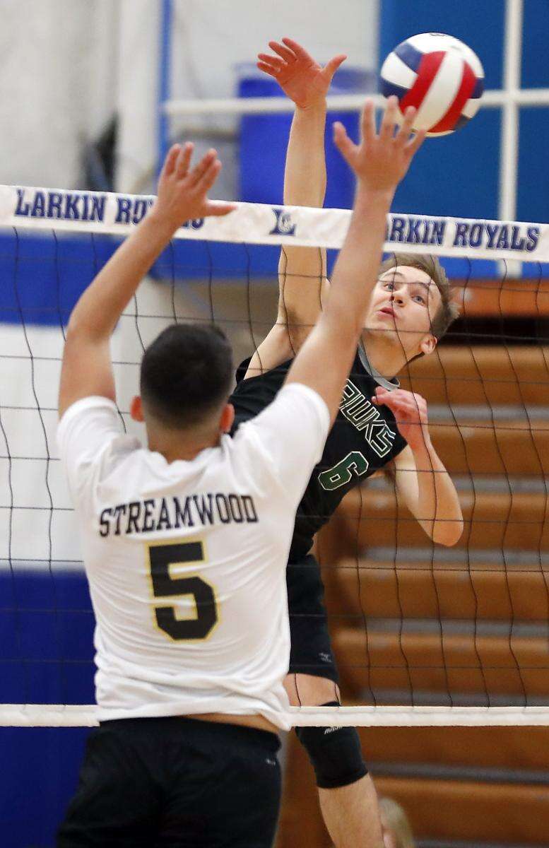 Bartlett's Martin Radomskifires a shot past Streamwood's David Flores Saturday during the U46 boys volleyball tournament at Larkin High School in Elgin.