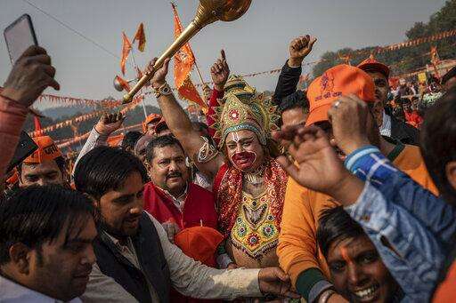 In this Sunday, Dec. 9, 2018 photo, a supporter of the Hindu nationalist political group Vishwa Hindu Parishad is dressed as the Hindu deity Hanuman during a rally in New Delhi, India. Tens of thousands of worshippers gathered in India's capital to demand construction of a Hindu temple on the ruins of a disputed 16th century mosque in northern Indian city of Ayodhya. (AP Photo/Bernat Armangue)