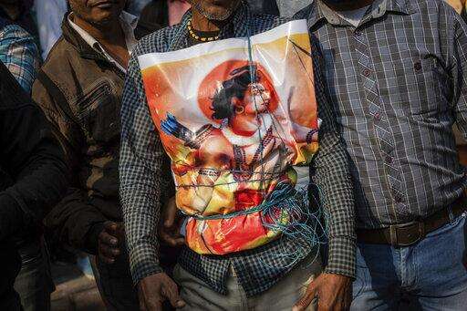 In this Sunday, Dec. 9, 2018 photo, a supporter of Hindu-extreme political group Vishwa Hindu Parishad wears a poster of the Hindu god Ram during a rally in New Delhi, India. (AP Photo/Bernat Armangue)