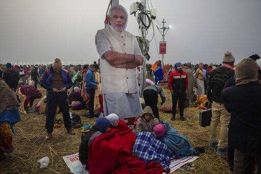 In this Monday, Jan. 14, 2018 photo, people stand near a poster of Prime Minister Narendra Modi during the Kumbh Mela festival in Allahabad, India. The government spent unprecedented sums on the heavily-attended Hindu Kumbh Mela festival, with Modi and the chief minister, Yogi Adityanath, himself a Hindu monk, appearing in countless posters. (AP Photo/Bernat Armangue)