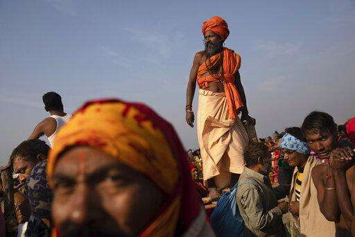 In this Tuesday, Jan. 15, 2019 photo, Hindus gather for a spiritual cleansing dip at Sangam, the confluence of the rivers Ganges, Yamuna and mythical Saraswati, during the Kumbh Mela festival in Prayagraj, India. (AP Photo/Bernat Armangue)