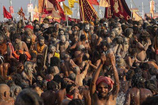 In this Tuesday, Jan. 15, 2019 photo, sadhus, Hindu holy men, take a holy dip at Sangam, the confluence of the rivers Ganges, Yamuna and mythical Saraswati, during the Kumbh Mela festival in Prayagraj, India. The city's Mughal-era name Allahabad was recently changed to Prayagraj by the Hindu nationalist government. The historic city name referred to Muslim Mughal rulers during the 16th century. The new name refers to the confluence of the rivers Ganges, Yamuna and mythical Saraswati, the site of the Hindu Kumbh Mela festival. (AP Photo/Bernat Armangue)