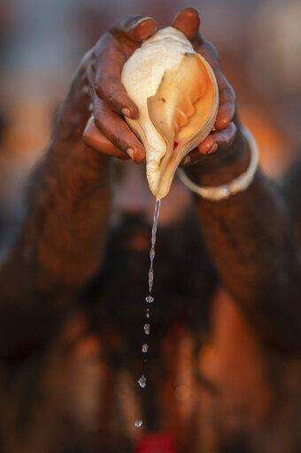 In this Tuesday, Jan. 15, 2019 photo, a sadhu, a Hindu holy man, pours water from a shell as he takes a ceremonial cleansing dip at Sangam, the confluence of the rivers Ganges, Yamuna and mythical Saraswati, during the Kumbh Mela festival in Prayagraj, India. (AP Photo/Bernat Armangue)