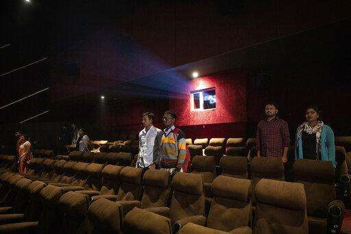 In this Monday, Nov. 26, 2018 photo, moviegoers stand as national anthem is played at a cinema before the screening of a movie in Lucknow, Uttar Pradesh, India. As with similar movements across the world, Hindu nationalism, once fringe, has now taken a central place in Indiaâs politics. (AP Photo/Bernat Armangue)
