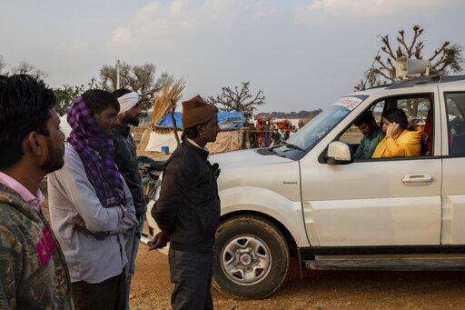 In this Friday, Jan. 25, 2019 photo, Hindu holy woman Sadhvi Kamal, 40, talks on the phone with members of her vigilante network in front Indian muslim cattle traders on the outskirts of Jaipur, Rajasthan, India. Thousands of volunteers, mostly young Hindu men from India's desert state of Rajasthan, disguise themselves by growing beards, wearing short, rounded skullcaps, and using Muslim names to infiltrate illegal cow smuggling operations. (AP Photo/Bernat Armangue)