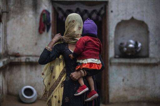 In this Tuesday, Jan. 22, 2019 photo, the wife of Saghir Khan,Anisa Khan, holds their daughter, Alfisa, at the family's house in Mirzapur. Saghir was beaten by a group of Hindus after being spotted transporting cows. (AP Photo/Bernat Armangue)