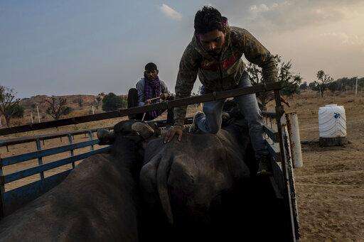 In this Friday, Jan. 25, 2019 photo, Muslim cattle traders load buffaloes into a pickup after being challenged by cow vigilantes on the outskirts of Jaipur, Rajasthan, India. (AP Photo/Bernat Armangue)