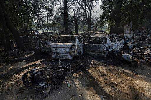 This Tuesday, Dec. 4, 2018 photo shows vandalized cars and other vehicles in Chingarwathi, near Bulandshahr, in the northern Indian state of Uttar Pradesh. The previous day, two people were killed in mob violence that began with accusations of cow slaughter in the area. About 280 people were injured in more than 100 attacks by vigilantes between May 2015 and December 2018, Human Rights Watch said in a recent report. (AP Photo/Bernat Armangue)