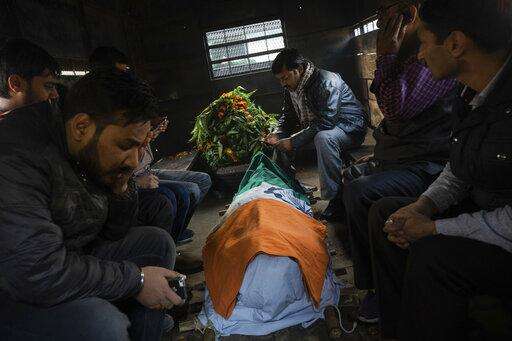 In this Tuesday, Dec. 4, 2018 photo, relatives cry next to the body of police Inspector Subodh Kumar Singh in Chingarwathi, near Bulandshahr, in the northern Indian state of Uttar Pradesh. The previous day, Singh and another person were killed in the mob violence that began with accusations of cow slaughter in the area. (AP Photo/Bernat Armangue)