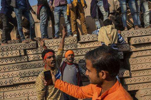 In this Sunday, Nov. 25, 2018 photo, Hindu hardliners gather next to building materials to be assembled in a temple dedicated to Hindu god Ram in Ayodhya, Uttar Pradesh, India. (AP Photo/Bernat Armangue)