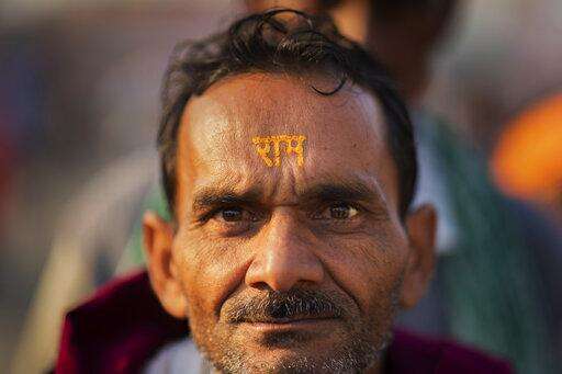 In this Sunday, Nov. 25, 2018 photo, a Hindu hardline supporter wears the the name of the god Ram written on his forehead in Ayodhya, Uttar Pradesh, India. Tens of thousands rallied to demand a Hindu temple be built on a site in northern India where hardliners in 1992 had attacked and demolished a 16th century mosque, sparking deadly Hindu-Muslim violence. Hindu groups say the mosque was built after a temple dedicated to Ram was destroyed by Muslim invaders. (AP Photo/Bernat Armangue)