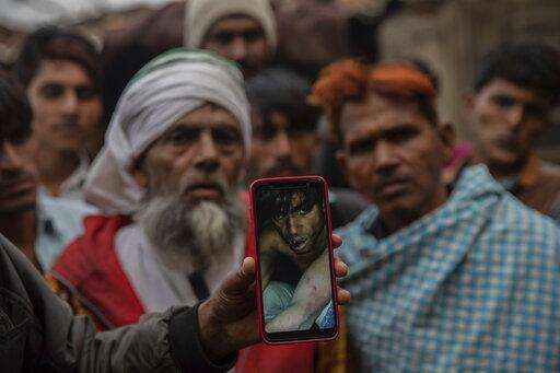 In this Tuesday, Jan. 22, 2019 photo, a man holds a phone showing a video of Muslim farmer Saghir Khan, 25, moments after being beaten, Mirzapur, India. Most of the attacks by so-called cow vigilantes from Hindu groups have targeted Muslims, who make up 14 percent of India's 1.3 billion people. Hindus make up about 80 percent of the population. (AP Photo/Bernat Armangue)
