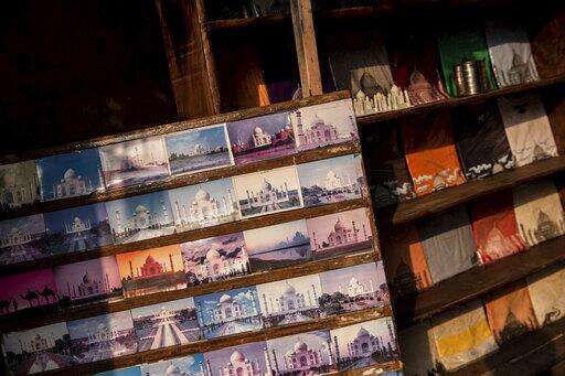 In this Wednesday, Jan. 23, 2019 photo, Taj Mahal postcards are displayed in a souvenir shop in Agra, India. Despite being a UNESCO world heritage site, the mausoleum built by Muslim Mughal emperor Shah Jahan was not included as a listed attraction by the Uttar Pradesh tourism ministry in 2017. Chief minister Adityanath said foreign dignitaries should be gifted with the Bhagavad Gita, a Hindu religious text, instead of a replica of the monument. (AP Photo/Bernat Armangue)