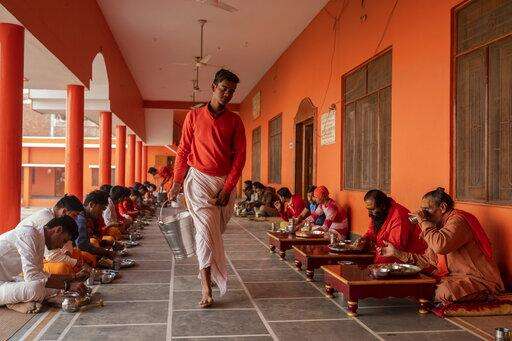 In this Wednesday, Dec. 12, 2018 photo, Hindu students of the Baghambari Math Gaddi have lunch in Prayagraj, India. As with similar movements across the world, Hindu nationalism, once fringe, has now taken a central place in Indiaâs politics. (AP Photo/Bernat Armangue)