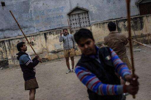 In this Tuesday, Dec. 11, 2018 photo, members of the Rashtriya Swayamsevak Sangh (RSS) gather during an early morning shakha, a daily training, in Prayagraj, India. (AP Photo/Bernat Armangue)