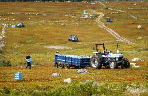 In this Friday, Aug. 24, 2018, file photo, Ken Cox carries trays of wild blueberries to a tractor at a farm in Union, Maine. The latest Census of Agriculture shows the number of U.S. farms and ranches has fallen but the remaining operations are larger and are responsible for a higher percentage of agricultural sales. The U.S. Department of Agriculture released the 2017 Census of Agriculture on Thursday, April 11, 2019. (AP Photo/Robert F. Bukaty, File) The Associated Press