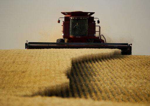 FILE - In this Friday, June 15, 2018 file photo, winter wheat is harvested in a field farmed by Dalton and Carson North near McCracken, Kan. The latest Census of Agriculture shows the number of U.S. farms and ranches has fallen but the remaining operations are larger and are responsible for a higher percentage of agricultural sales. The U.S. Department of Agriculture released the 2017 Census of Agriculture on Thursday, April 11, 2019. (AP Photo/Charlie Riedel, File) The Associated Press