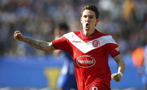 Duesseldorf's Benito Raman celebrates his goal during the Bundesliga soccer match between Hertha BSC Berlin and Fortuna Duesseldorf in Berlin, Germany, Saturday, April 6, 2019. (Andreas Gora/dpa via AP) The Associated Press