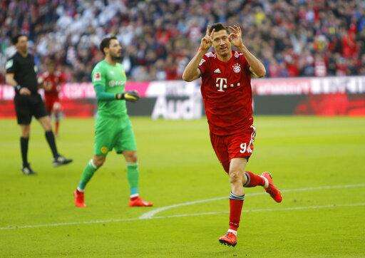 Bayern's Robert Lewandowski celebrates after scoring his side's second goal during the German Bundesliga soccer match between FC Bayern Munich and Borussia Dortmund in the Allianz Arena in Munich, Germany, on Saturday, April 6, 2019. (AP Photo/Michael Probst) The Associated Press