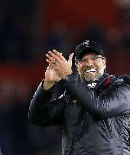Liverpool's manager Juergen Klopp celebrates at the end of the English Premier League soccer match between Southampton and Liverpool at St Mary's stadium in Southampton, England Friday, April 5, 2019. (AP Photo/Kirsty Wigglesworth) The Associated Press