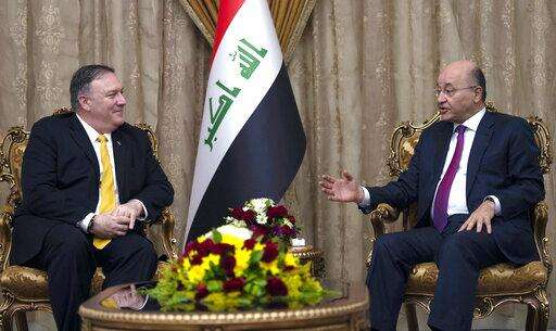 FILE - In this Jan. 9, 2019 file photo, US Secretary of State Mike Pompeo, left, meets with Iraqi President Barham Salih, in Baghdad, Iraq. Iraq is seeking to reclaim a leadership role in the Arab world after decades of conflict. It is focusing on a centrist policy and its top leaders are determined to maintain good relations with both Iran and the United States. (Andrew Caballero-Reynolds/Pool, File) The Associated Press