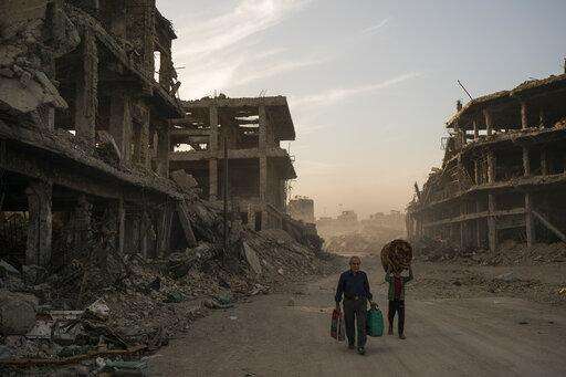 FILE - In this Nov. 15, 2017 file photo, Haider, left, and Abdullah carry belongings they collected from their damaged house to wash before returning to live in the Old City of Mosul, Iraq. A flurry of recent diplomatic activity and high-profile visits to the Iraqi capital, points to a new era of openness as the nation sheds its war image and re-engages with the world. Iraq needs much help and investment to rebuild its cities -- something it can only get from oil- and gas-rich Gulf countries, including Saudi Arabia. (AP Photo/Felipe Dana, File) The Associated Press